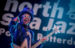As you might know a long time ago North Sea Jazz branched off from being a pure jazz festival to a more encompassing festival that celebrates the various forms of black music. Therefore, my first steps in Ahoy shouldn’t be exclusively about jazz. Luckily, regular attendee and master funkster Bootsy Collins is performing just around the corner with his 13-piece Funk Unity Band. And oh my, what a party. Collins, who constantly changes between various glitter outfits, a high hat and a white afro wig, whips up the crowd with some plucky base play. Meanwhile The Funk Unity Band, fullydressed in spacesuits, bring some catchy P-funk groove lines that make songs such as ‘I’d Rather Be With You‘ and ‘Bootzilla‘ impossible not to dance to. Oldtimer Collins, once a member of the backing bands of James Brown and George Clinton, goes complete over the top by presenting his glow-in-the-dark star shaped bass guitar and hereafter decides honor the audience with a real life visit. While hugging and dancing he walks into the crowd whilst The Funk Unity Band sloganeers ‘touch’ along with it. After security helpes Collins back on stage the party slowly comes to an end. Phew, absolutely a great and sparkling show.